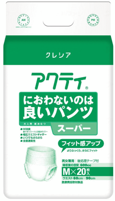 製品仕様 商品名 【ケース販売】 アクティ におわないのは良いパンツ スーパー 数量 S:22枚入り×4袋 M:20枚入り×4袋 L:18枚入り×4袋 サイズ Sサイズ:(ウエストサイズ)50-75cmMサイズ:(ウエストサイズ)60-90cm Lサイズ:(ウエストサイズ)80-130cm 吸水量 S:総吸収量950cc/目安吸収量600cc(おしっこ約4回分) M/L:総吸収量1050cc/目安吸収量600cc(おしっこ約4回分) 商品説明 ○幅広ウエストギャザー お腹まわりをしめつけすぎずズレ落ちを軽減 ○W消臭 気になる臭いを閉じ込める銀イオン配合の抗菌・消臭シートと消臭ポリマー※ アンモニアについての消臭効果がみられます ○全面通気性 ムレを防いでお肌さらさら ○お肌さらさらトップシート 尿をすばやく吸収、逆戻りも防止 ○後処理テープ付き ○ふっくらフィット 股下にぴったりフィット 注意事項 ※画面上と実物では多少色具合が異なって見える場合もございます。